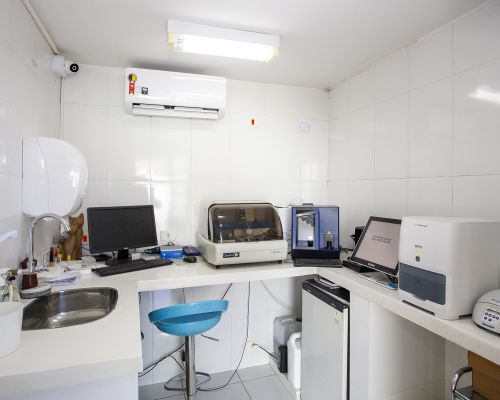 Laboratório próprio, equipado para realizar exames de sangue, urina e outros, com agilidade e precisão nos resultados.